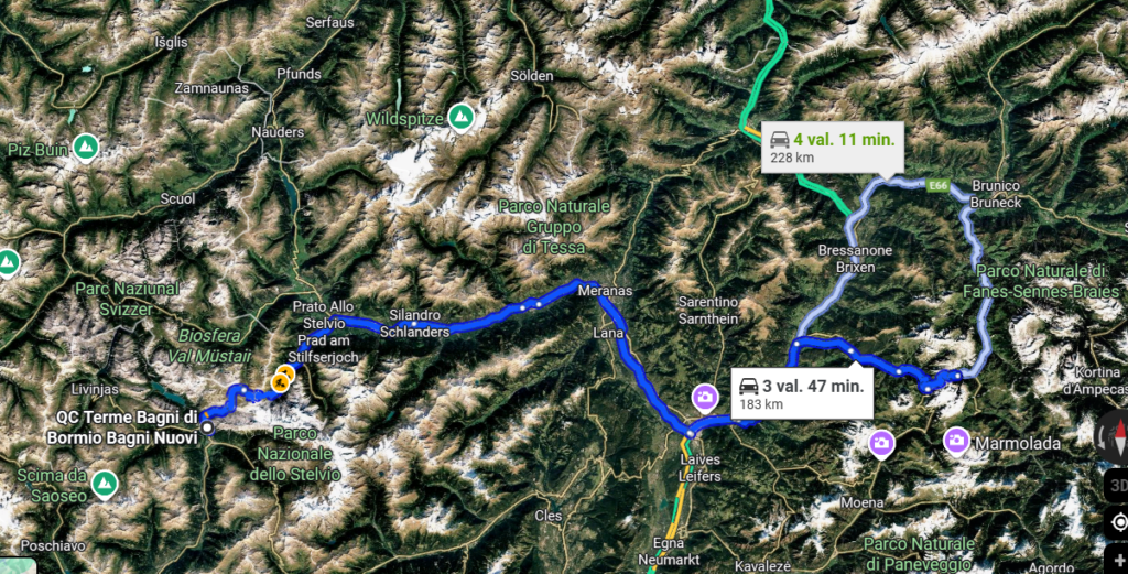 • Atstumas nuo Bormio: ~125 km (~2 val. 35 min. kelio per SS38, per Meraną).