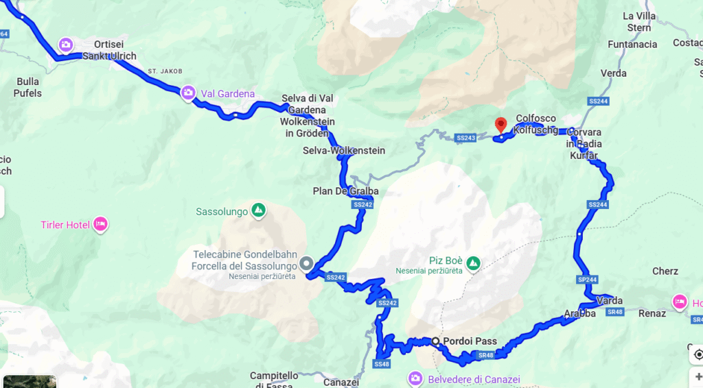 • Nuoroda į maršrutą: Google Maps – Passo Pordoi